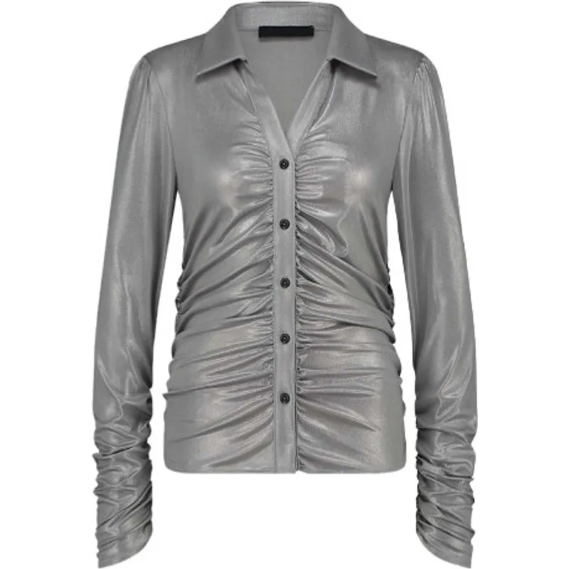 De Luisa Blouse (SMBF724134) van JANE LUSHKA is een blouse met klassiek kraagje, doorknoopsluiting en lange mouwen. De blouze heeft gesmoqte details aan de binnenzijde van de mouwen, aan de zijkant en bij de knoopsluiting. Dit model heeft een aangesloten pasvorm, valt op de heup en is uitgevoerd in de kleur Silver. De glimmende stof is gemaakt van Polyesyter en Elastaan