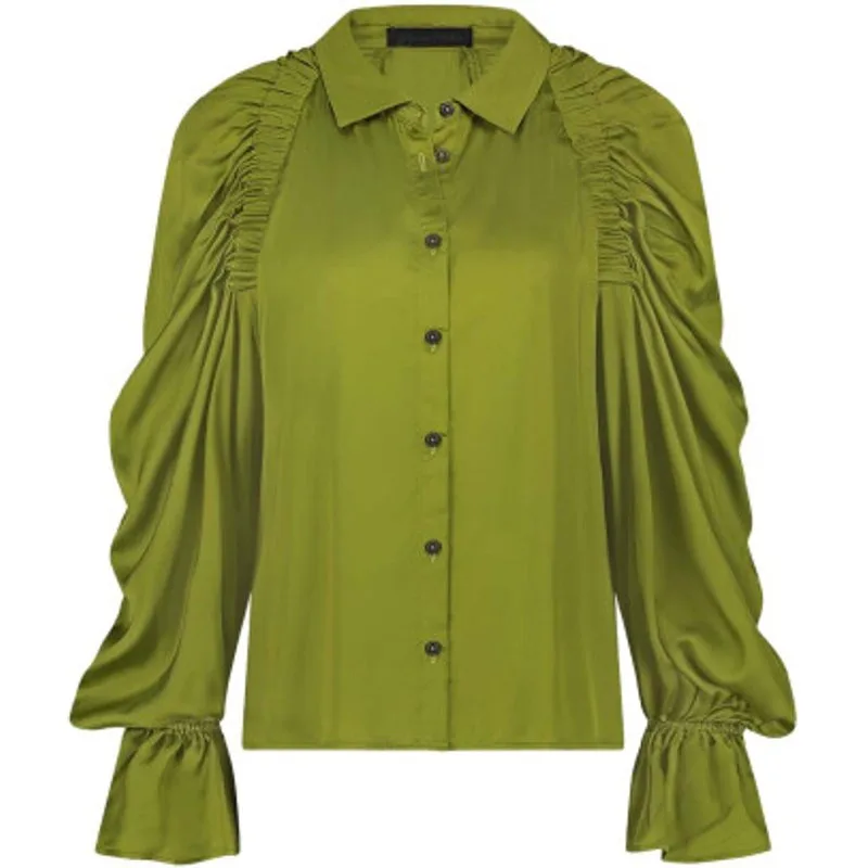 De Mima Blouse (SEI724121) van JANE LUSHKA is een blouse met klassieke kraag, doorknoopsluiting en lange pofmouwen die aan de onderzijde zijn afgewerkt met elastiek. De blouse heeft een lage mouwinzet die aan de voor en achterzijde is afgewerkt met gesmoqte details. Dit model heeft een rechte soepelvallende pasvorm, valt over de heup en is uitgevoerd in de kleur Olivia Green. De zachte en gladde stof is gemaakt van Viscose.