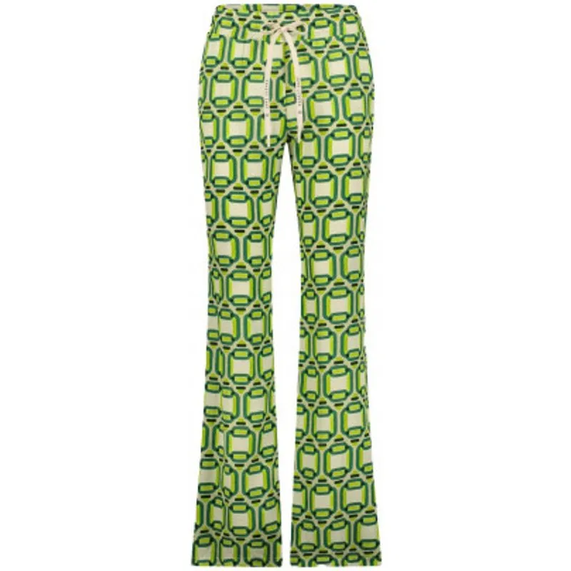 De OSL22321101Carola pants van JANE LUSKA lichte elastische technical jersey broek met een aansluitende pasvorm, wijde pijpen en een trekkoord in de taille. De broek heeft steekzakken aan de voorzijde en 1 dicht gestikte paspelzak aan de achterzijde. Deze broek is uitgevoerd in een all-over print in de kleur Green Lime.