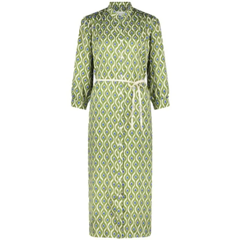 De OSG9232680 Steffi Dress Long van JANE LUSHKA is een lange jurk met knoopsluiting, hooggesloten kraag, lange mouwen met manchetten, plooien op de rug en een bijpassend strikceintuur. Deze jurk is uitgevoerd in een retro print in de kleur green.