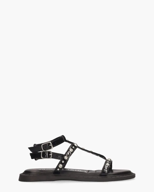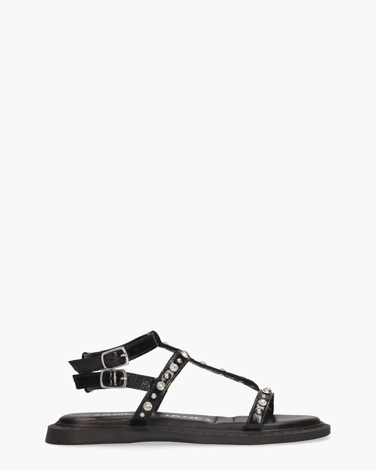 Deze J-142 sandalen voor dames van Janet&Janet trekken de aandacht met subtiele details. Het bovenwerk van zwart lakleer is afgewerkt met zilveren studs en kristalletjes– speels en verfijnd tegelijk. De twee enkelbandjes met zilveren gespjes zorgen voor een fijne pasvorm. Binnenin zorgt het leren voetbed voor comfort, terwijl ook de