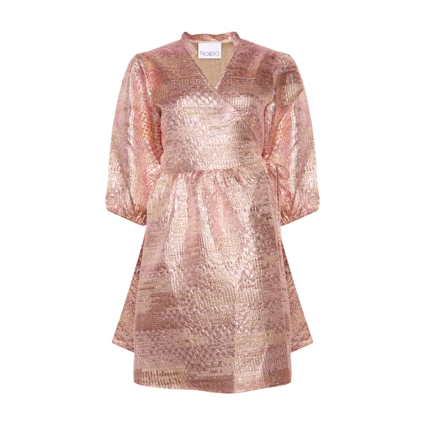 Een oogverblindende wikkeljurk met volumineuze mouwen en een flatterende, getailleerde taille. Gemaakt van een gestructureerde, glanzende stof die het licht prachtig vangt, is dit de ultieme keuze voor feestelijke gelegenheden. Verfijnd en toch speels — perfect om stijlvol te vieren.