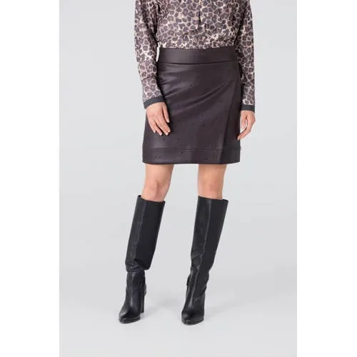 Deze WARA rok van JANSEN Amsterdam is een imitatieleren rok met een elastische tailleband. De strass steentjes geven extra detail, de lengte is kort en de kleur is donkerbruin.