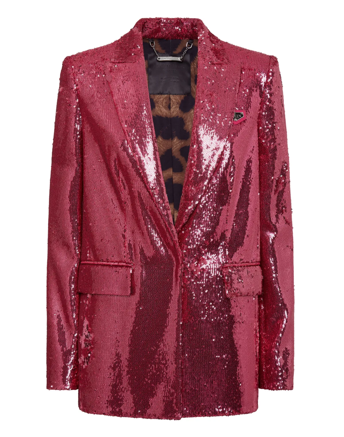 Losvallend jasje met enkele knoop van pailletten. Een badge met het logo is genaaid op de linkerborst. Verborgen knoopsluiting. Twee klepzakken. Binnenvoering.