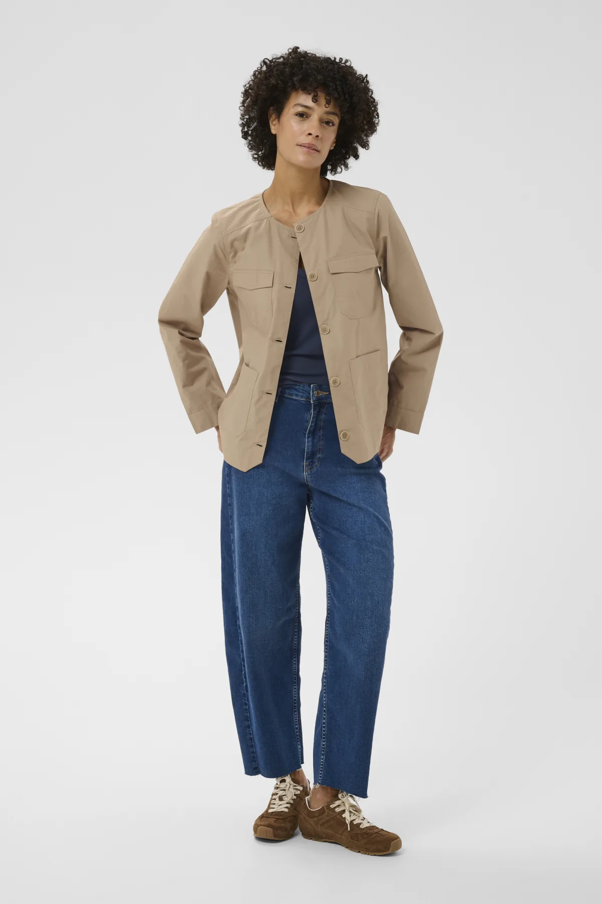 Utility jack met rechte pasvorm, knoopsluiting en vier opgestikte zakken. Ronde hals en lange mouwen zorgen voor een strakke, moderne touch.