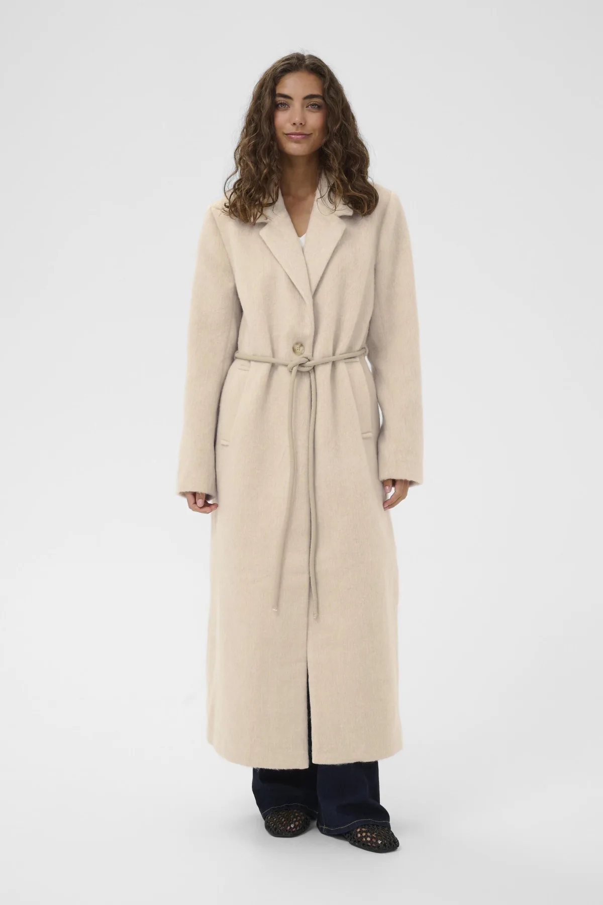 Lange jas met zachte uitstraling, getailleerd model en klassieke reverskraag. Strikceintuur in de taille, enkele knoopsluiting en steekzakken.