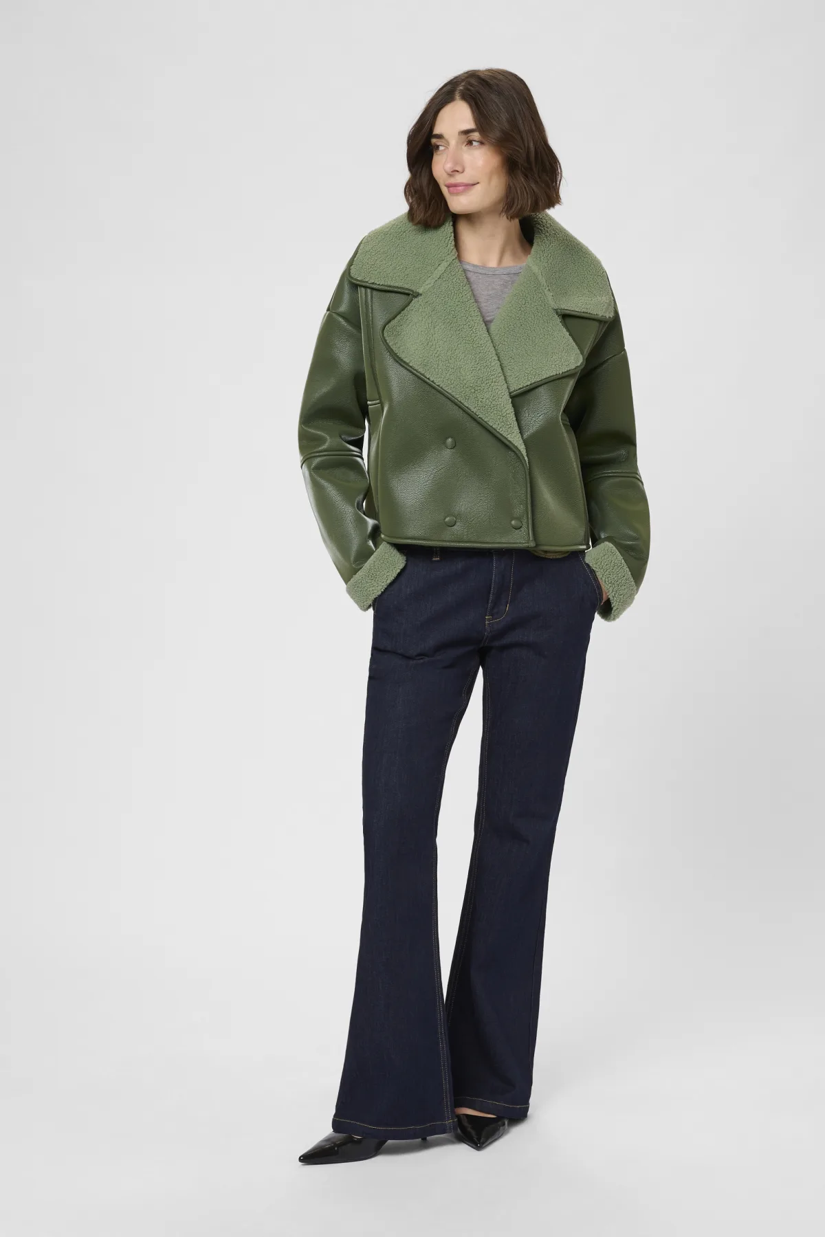 Dames jas van imitatieleer met een loose fit, brede reverskraag en dubbele knoopsluiting. Het korte ontwerp met zachte voering biedt comfort en veelzijdigheid voor dagelijks gebruik.