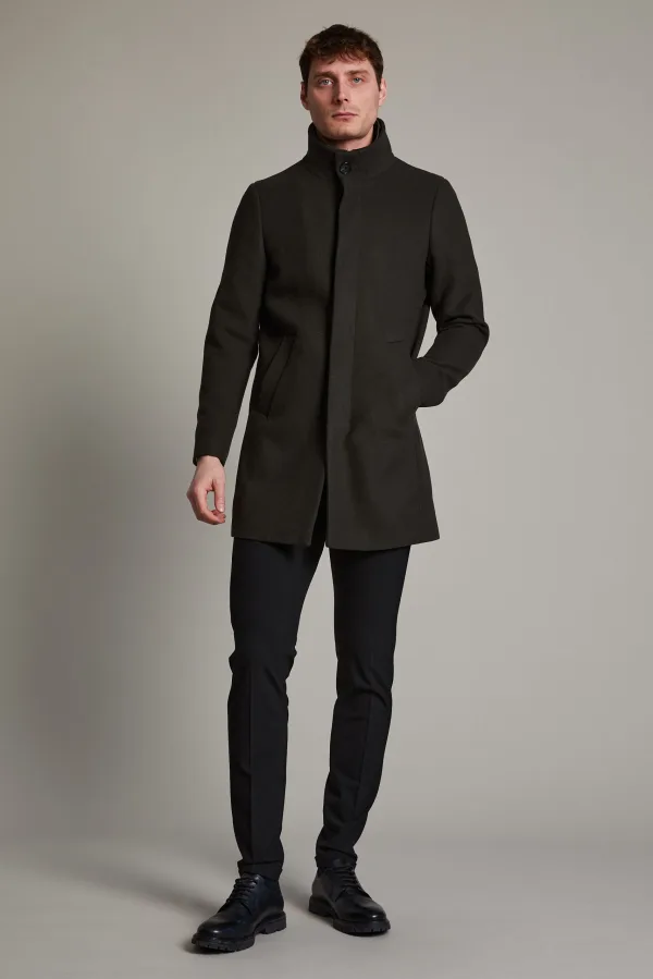 Herenmantel met tijdloze, rechte pasvorm en modern silhouet. Voorzien van opstaande kraag, lange mouwen en functionele zakken. Comfortabel en geschikt voor elke gelegenheid.