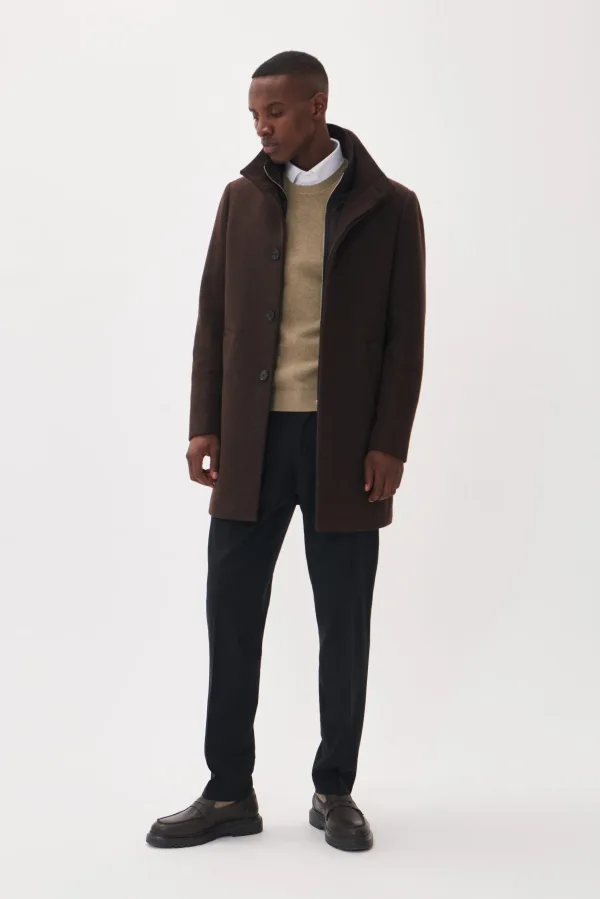 Herenmantel met tijdloze, rechte pasvorm en modern silhouet. Voorzien van opstaande kraag, lange mouwen en functionele zakken. Comfortabel en geschikt voor elke gelegenheid.