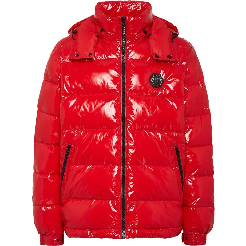 Hoogglanzende nylon bomber met dons en capuchon. Het kledingstuk is volledig gewatteerd. Een saffiaanleren patch met de PP Hexagon is op de linkerborst genaaid. Ritssluiting en twee steekzakken met rits. Manchetten met drukknopen. Koord onderaan de zoom. Zachte voering.