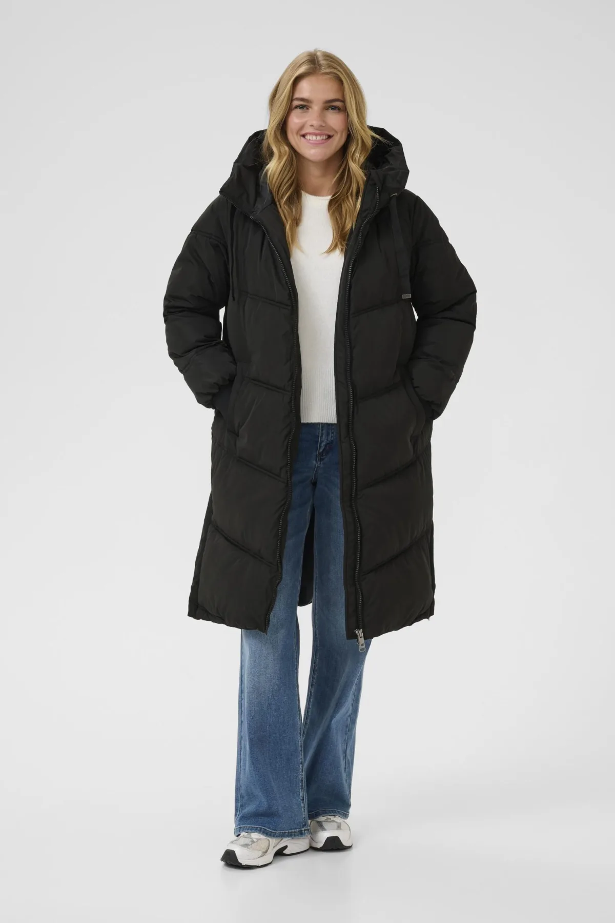 Deze lange gewatteerde jas heeft een relaxte pasvorm met capuchon en doorlopende ritssluiting. Geribde boorden en quilted details bieden comfort bij koud weer.
