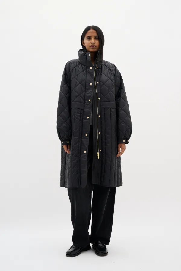 Gewatteerde damesjas met relaxte pasvorm, opstaande kraag en drukknoopsluiting. Lange mouw, halflange lengte voor dagelijks comfort.