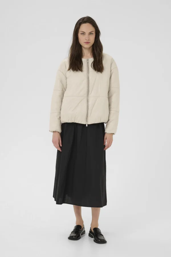 Pufferjack met rechte pasvorm, ronde hals en volledige ritssluiting. Mat, subtiel getextureerd oppervlak en twee steekzakken maken het af.