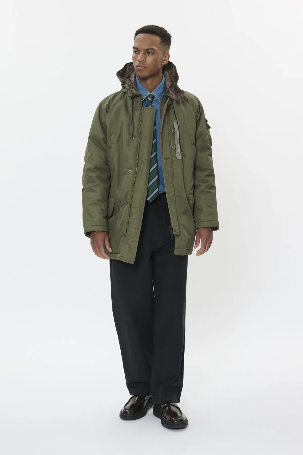 Heren parka jas met rechte pasvorm, hoge kraag met capuchon, ritssluiting en meerdere zakken. Comfortabel voor dagelijks gebruik en buitenactiviteiten. Wassen op 30°, niet bleken, drogen in droger behoedzaam, Druipnat ophangen, koud strijken max. 110° C, 100% Nylon (Gerecycled)