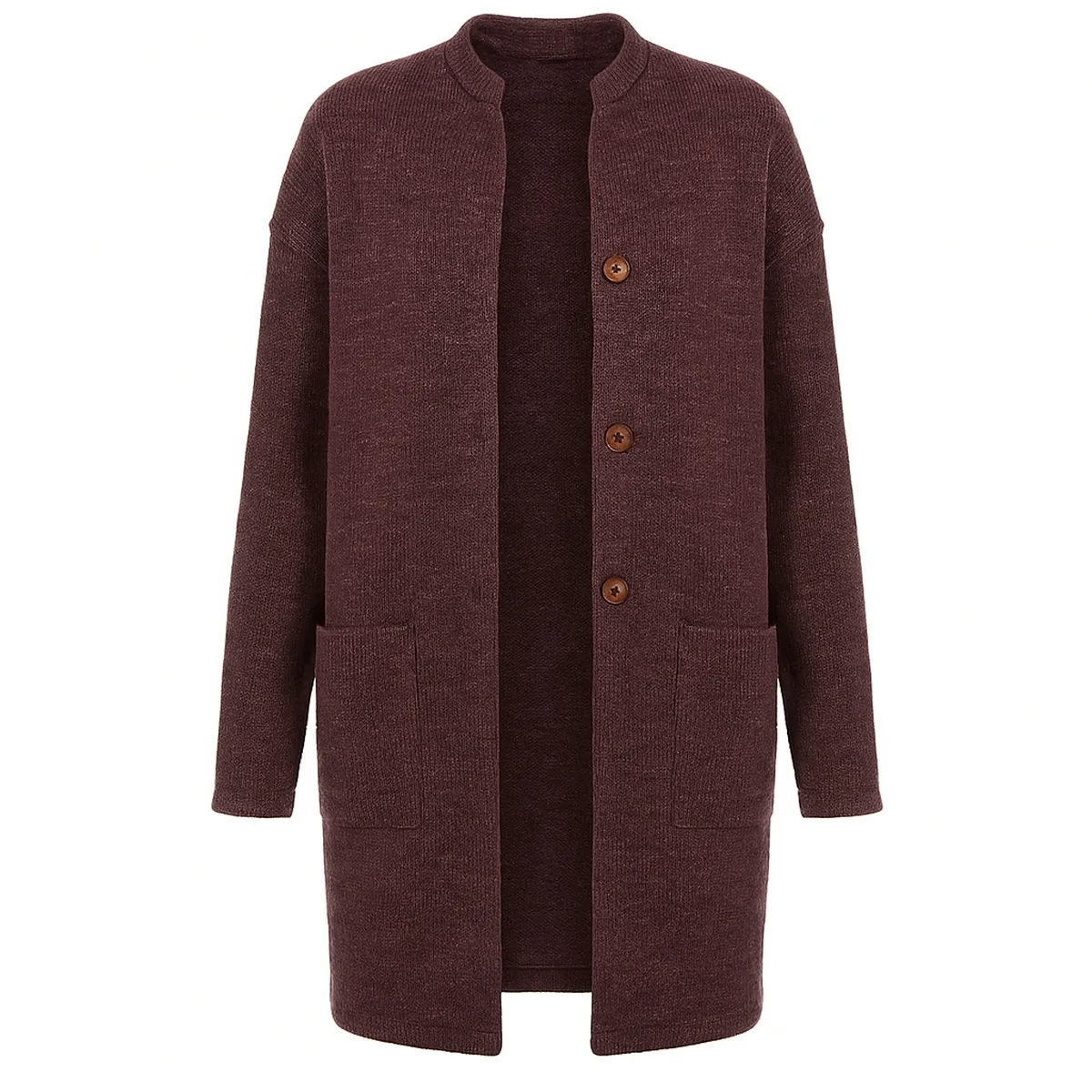 Blijf warm en moeiteloos stijlvol met deze oversized gebreide jas, gemaakt van een premium mix van 57% wol, 41% acryl en 2% polyamide. Deze jas met knoopsluiting is ontworpen in een rijke bordeauxrode tint en heeft verlaagde schouders, grote zakken aan de voorkant en een relaxed silhouet dat prachtig over elke outfit past. De gezellige textuur en het gestructureerde gevoel maken het de perfecte keuze voor overgangsweer en laagjes in het koele seizoen.