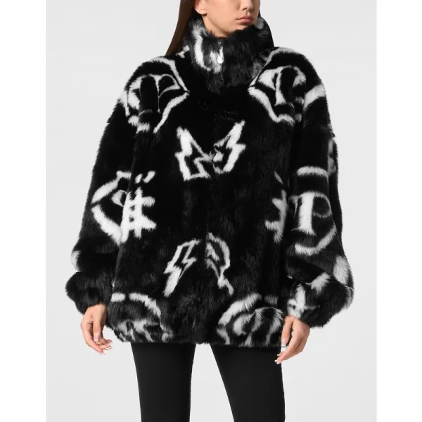 Oversized bomber van veganistisch bont met het nieuwe monogram erop gedrukt. Ritssluiting. Twee paspelzakken. Elastische manchetten en onderkant. Ruitvormige gewatteerde zijden voering.