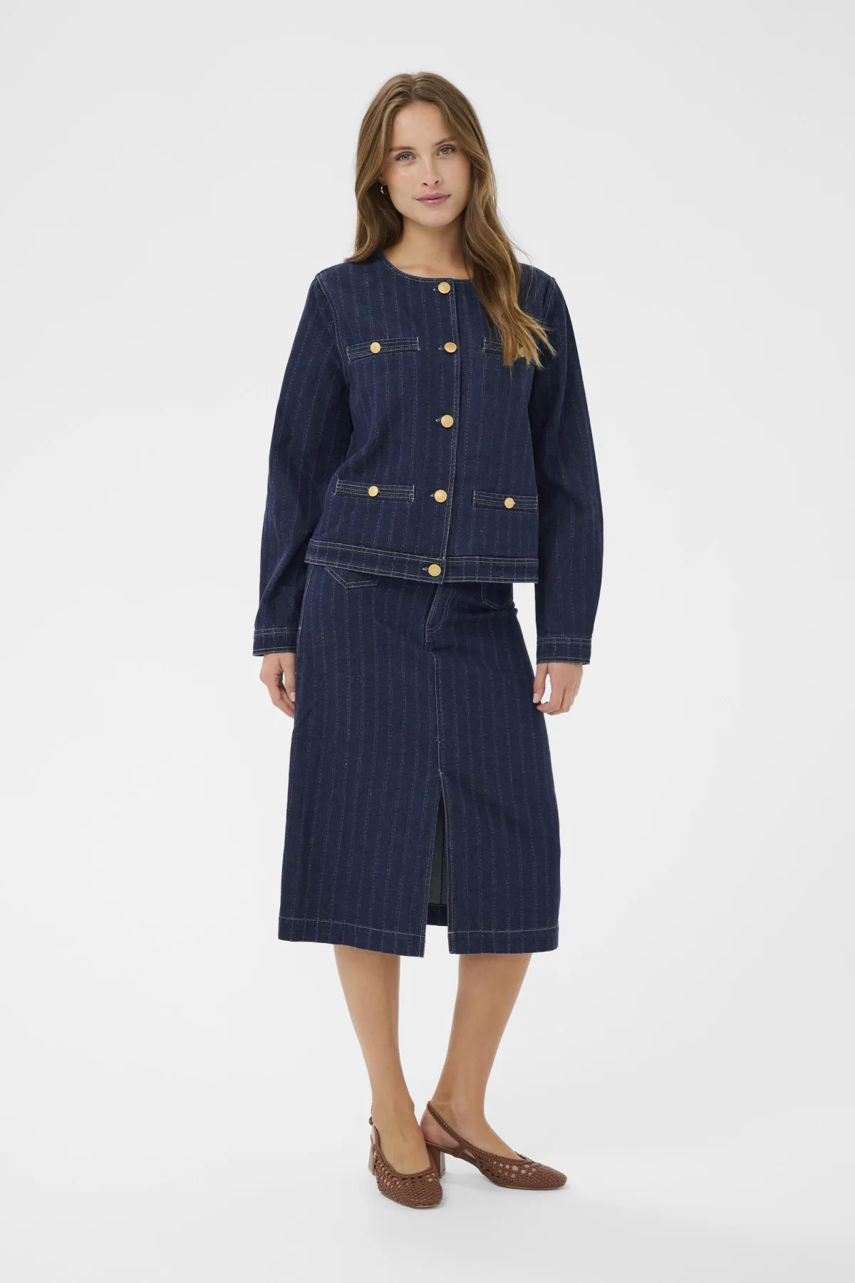 Denim damesjack met rechte pasvorm en ronde halslijn. Voorzien van knoopsluiting en opgestikte zakken. Lange mouwen voor optimaal draaggemak.