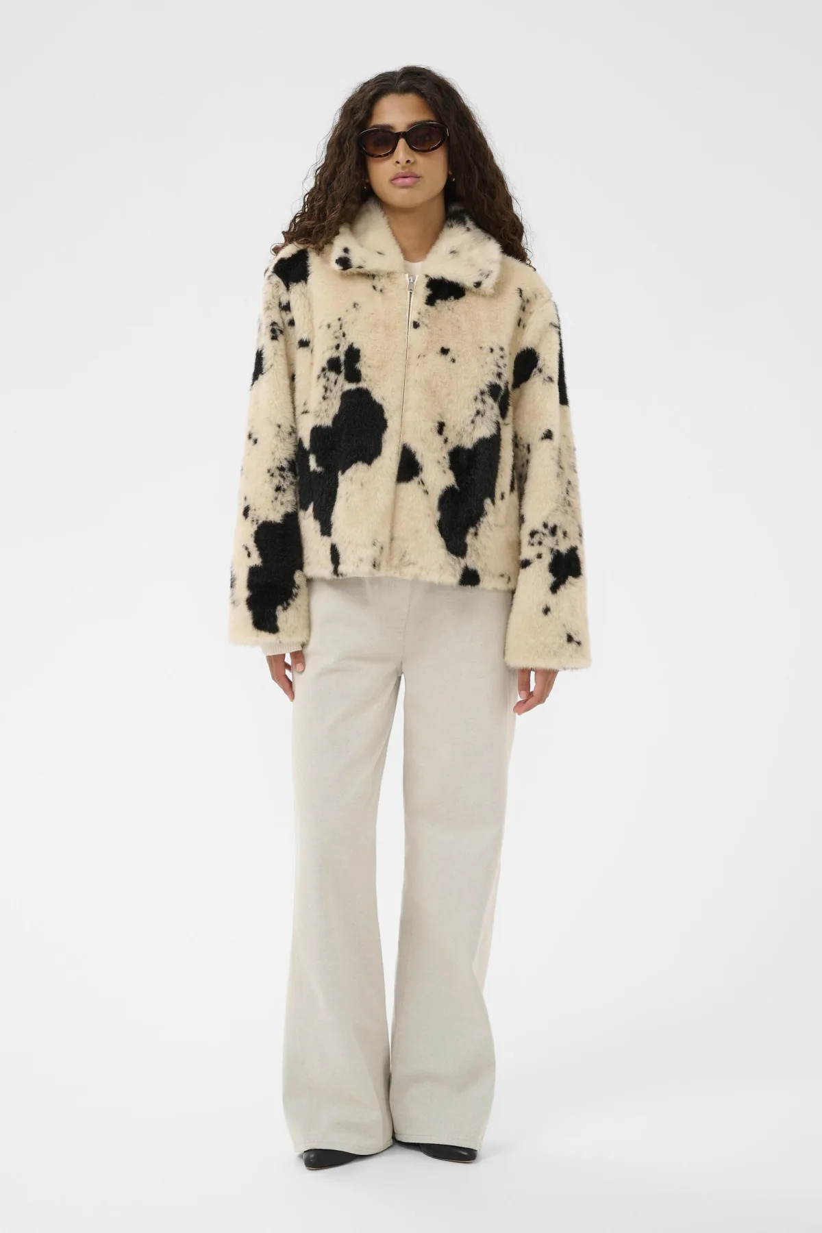 Faux fur jas met boxy silhouet, ritssluiting en klassieke kraag. Het volledige item is voorzien van een opvallend vlekkenpatroon en rechte lange mouwen.