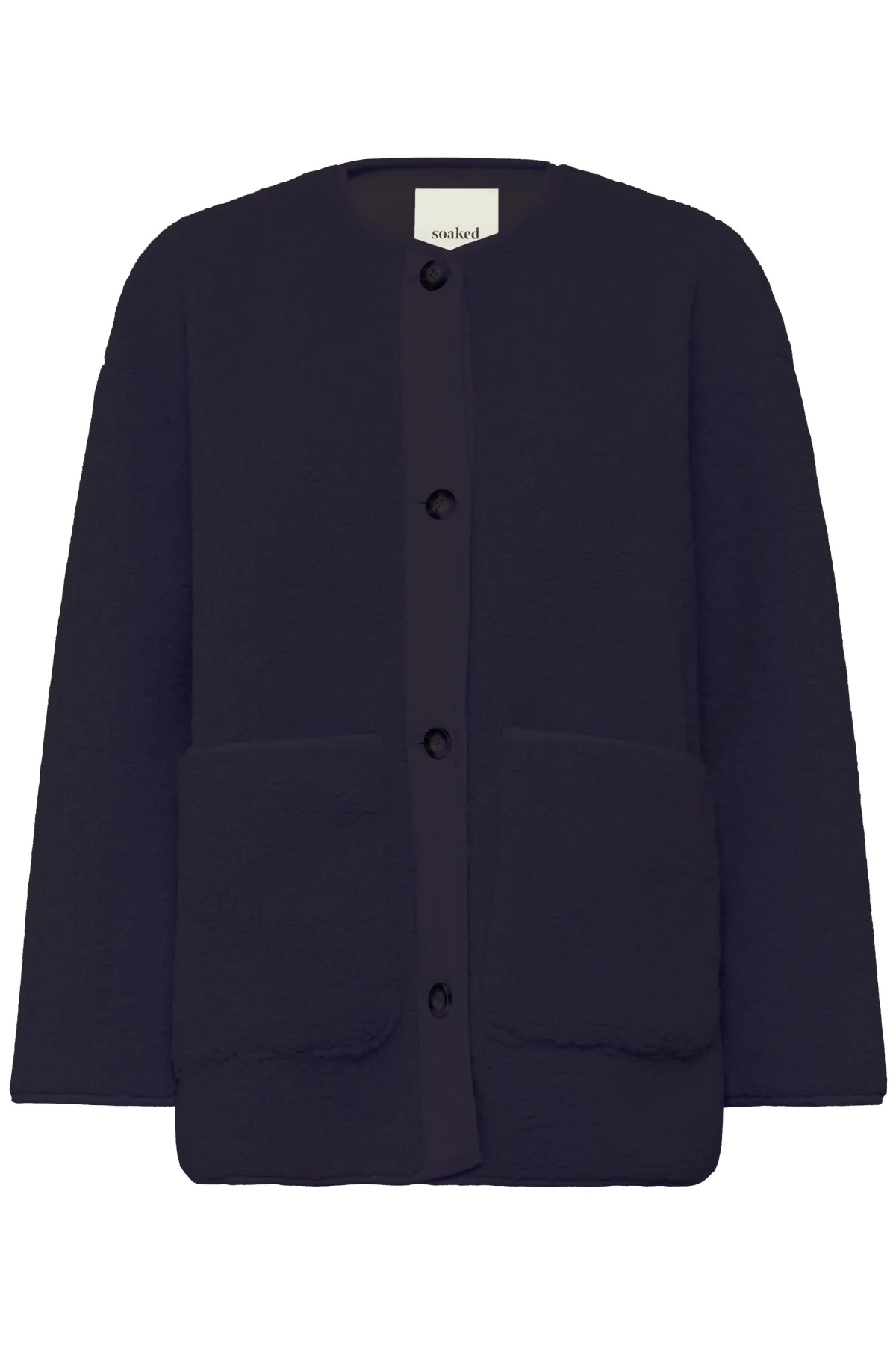 Boxy jas met zachte, getextureerde look, ronde hals, rechte pasvorm, drukknoopsluiting, wijde lange mouwen en twee grote opgestikte zakken.