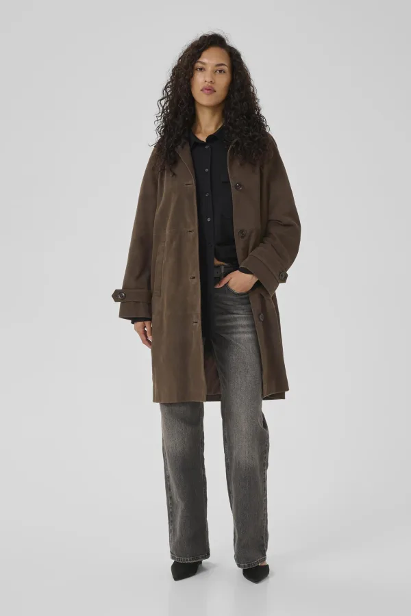 Deze dames suède jas heeft een relaxte pasvorm en klassieke knoopsluiting. Voorzien van kraag, lange mouwen en knielengte voor veelzijdige stijl en comfort.