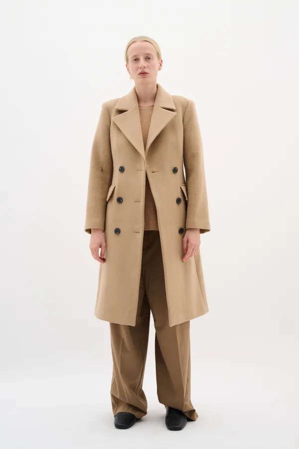 Deze damesmantel heeft een rechte pasvorm, dubbele knoopsluiting, klassieke reverskraag en klepzakken. Comfortabel en veelzijdig voor elke gelegenheid.