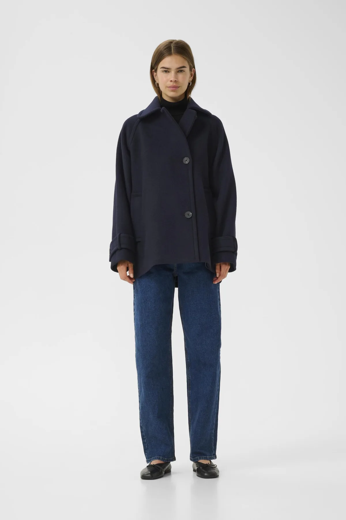 Wollen jas met een losse pasvorm, klassieke kraag en knoopsluiting. Opgerolde mouwdetails geven een tijdloze uitstraling en draagcomfort.