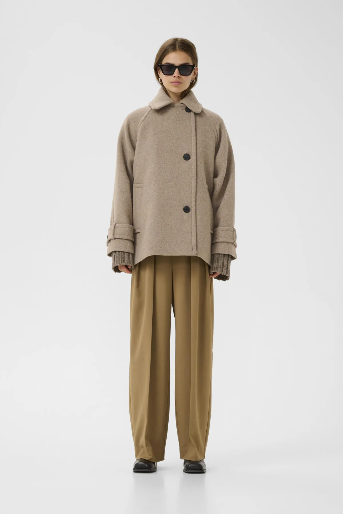 Wollen jas met een losse pasvorm, klassieke kraag en knoopsluiting. Opgerolde mouwdetails geven een tijdloze uitstraling en draagcomfort.