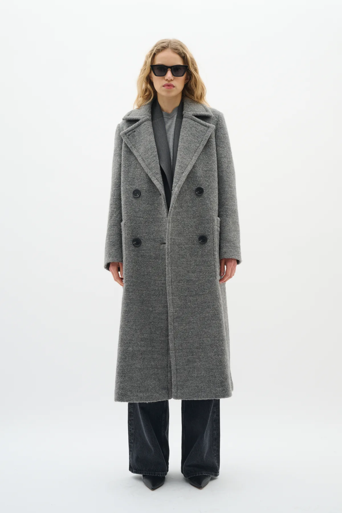 Deze lange double-breasted mantel heeft een relaxte pasvorm met gestructureerde schouders en reverskraag. Knoopsluiting en lange mouwen zorgen voor comfort en veelzijdigheid.