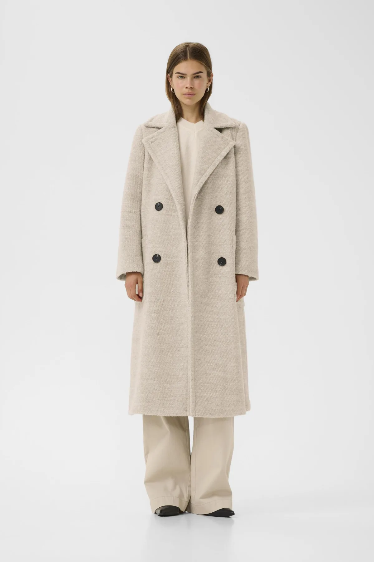 Deze lange double-breasted mantel heeft een relaxte pasvorm met gestructureerde schouders en reverskraag. Knoopsluiting en lange mouwen zorgen voor comfort en veelzijdigheid.