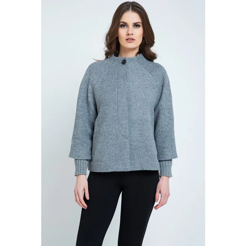Winterjas met lange mouwen. Ronde hals. Raglanmouwen. 14 cm elastiek aan de manchetten. Sluiting vooraan met verborgen knopen en een externe knoop bovenaan. 2 zakken vooraan. Volledig gevoerd. Subtiel A-lijn silhouet. Lengte voor maat 38: 66cm. Ons model is 178cm en draagt maat 36.