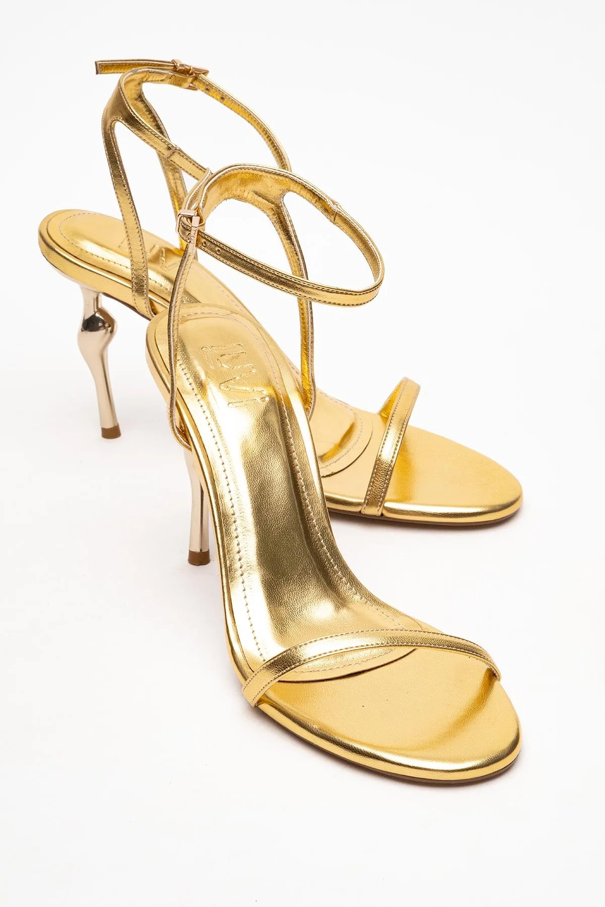 Een moderne enkelbandje pump die minimalistische elegantie combineert met sculpturale hakhdetails