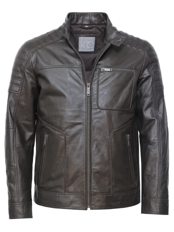 Het leren jack is versierd met uitgebreide details zoals casual ritszakken en decoratieve stiksels.