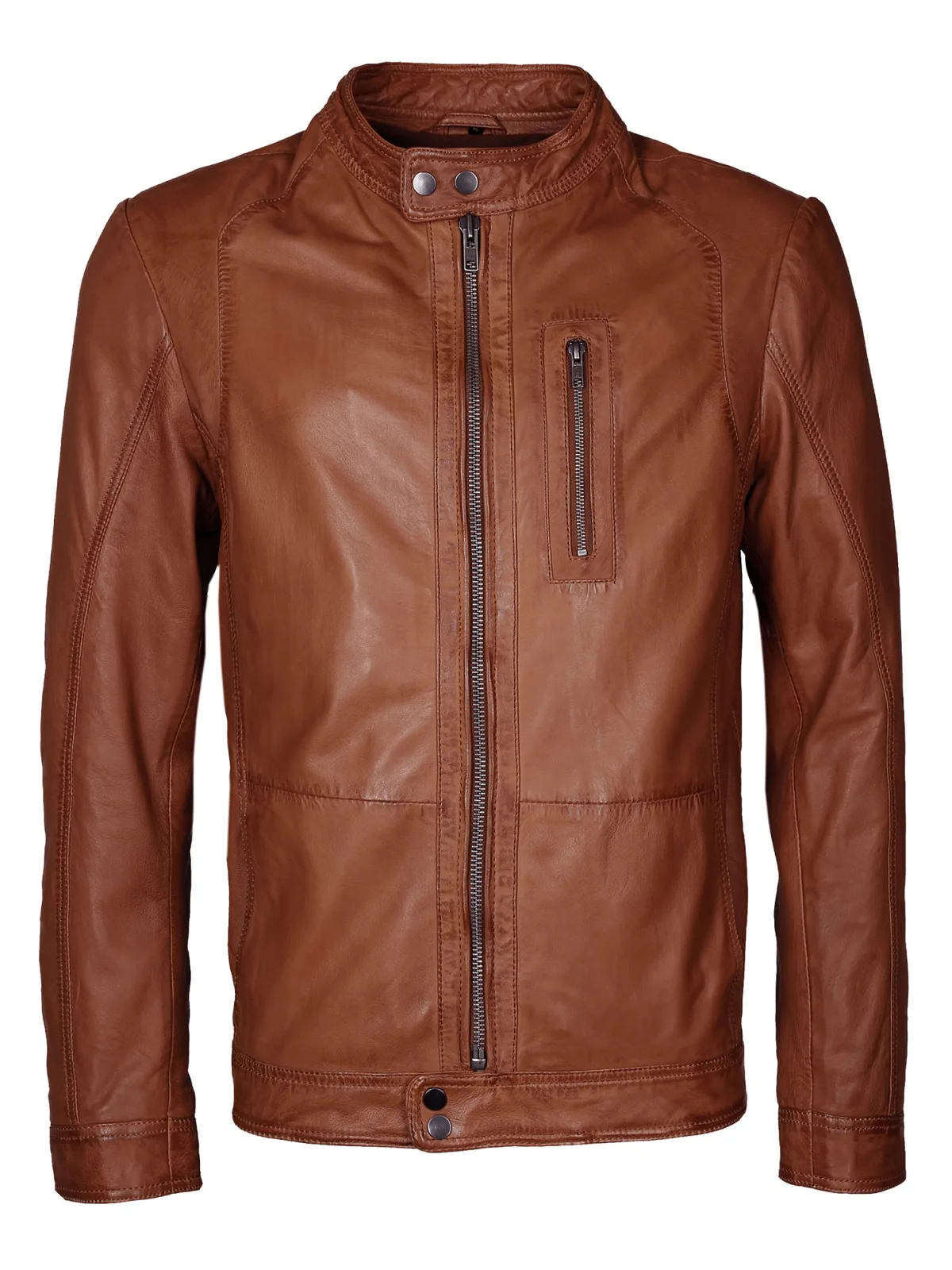 Design: Ritssluiting, Staande kraag, Borstzak, Zakken aan de zijkant; Type sluiting: Ritssluiting; Type jas: Bikerjack; Voering: Licht gevoerd; Materiaal: Leer; Motief: Effen; Extra's: Op staal naden; Pasvorm: Normale pasvorm