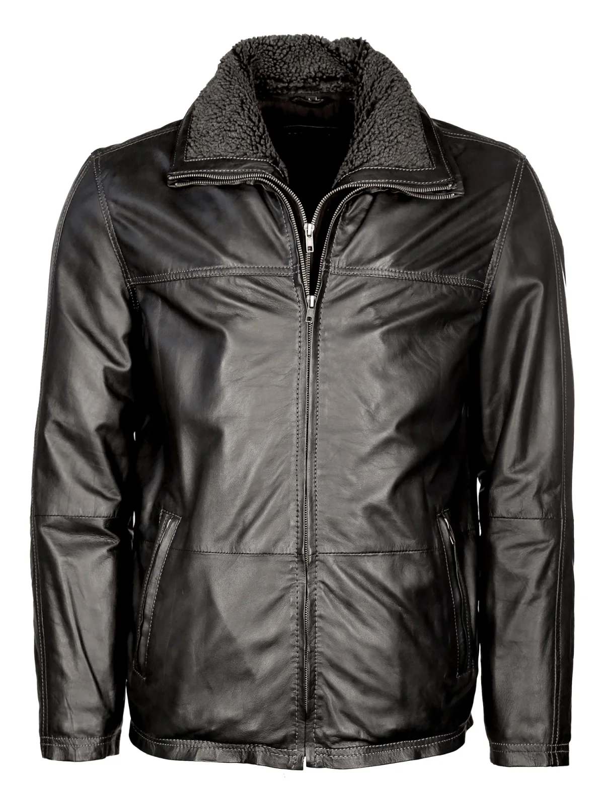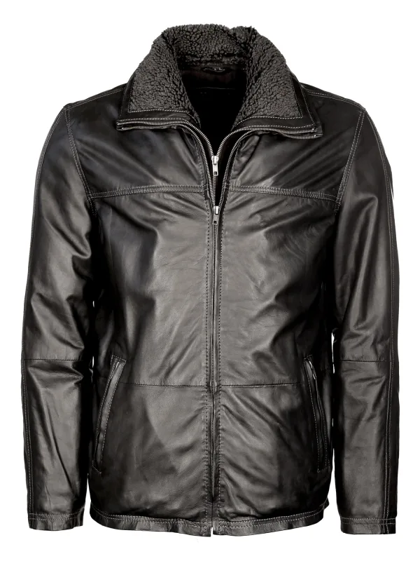 Klassische Lederjacke mit Kunstfellkragen. Weiches Leder, komfortable Seitentaschen und der Reißverschluss machen diese Jacke in Verbindung mit ihrer klassischen Passform zu eine Allrounder. In der Freizeit oder zum Business Look mit dieser Jacke machen Sie in jeder Hinsicht eine gute Figur.