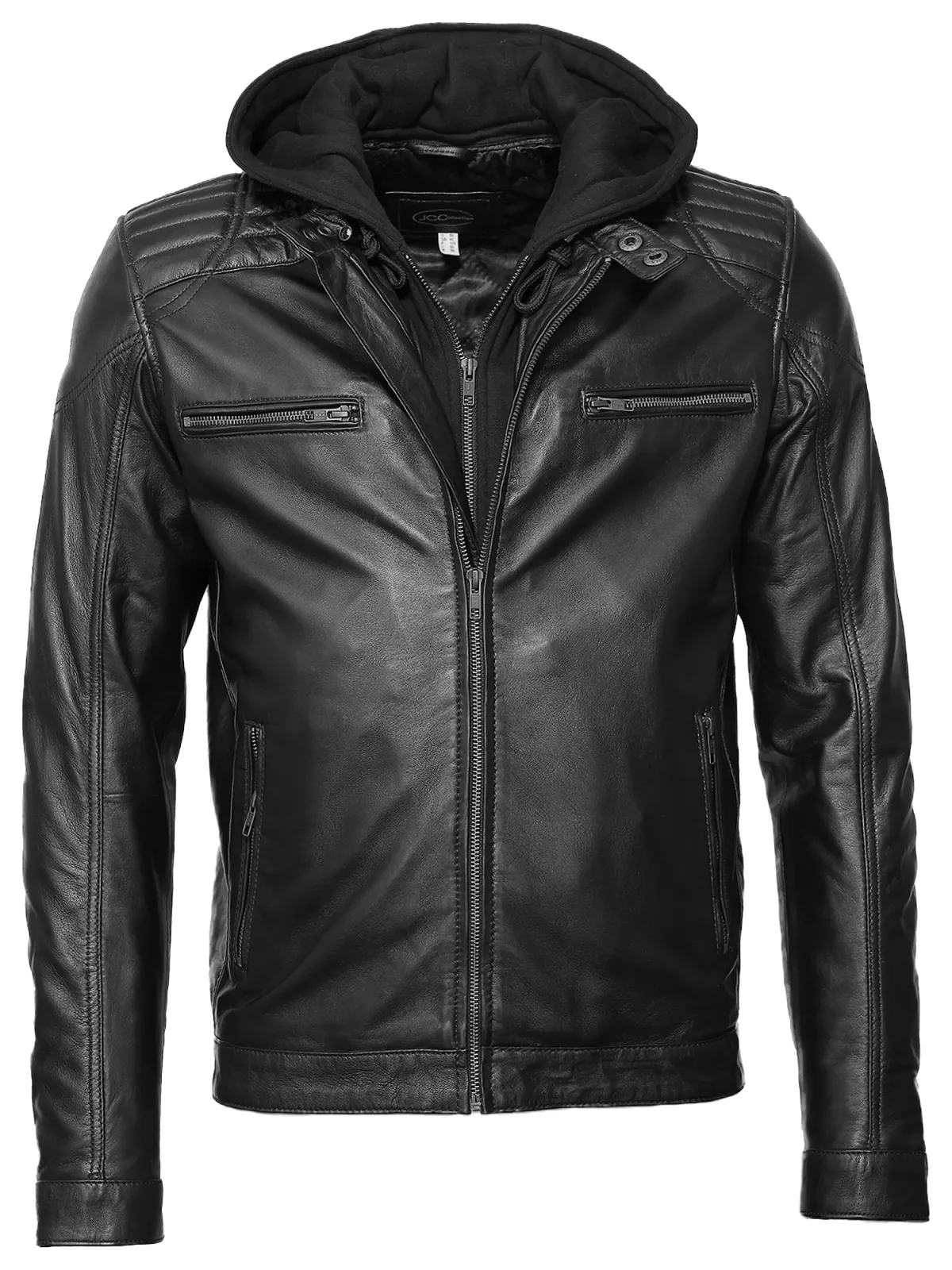 Design: Met capuchon, Borstzak, Ritszakken aan de zijkant; Type sluiting: Ritssluiting; Type jas: Bikerjack; Voering: Licht gevoerd; Materiaal: Leer; Motief: Effen; Pasvorm: Normale pasvorm