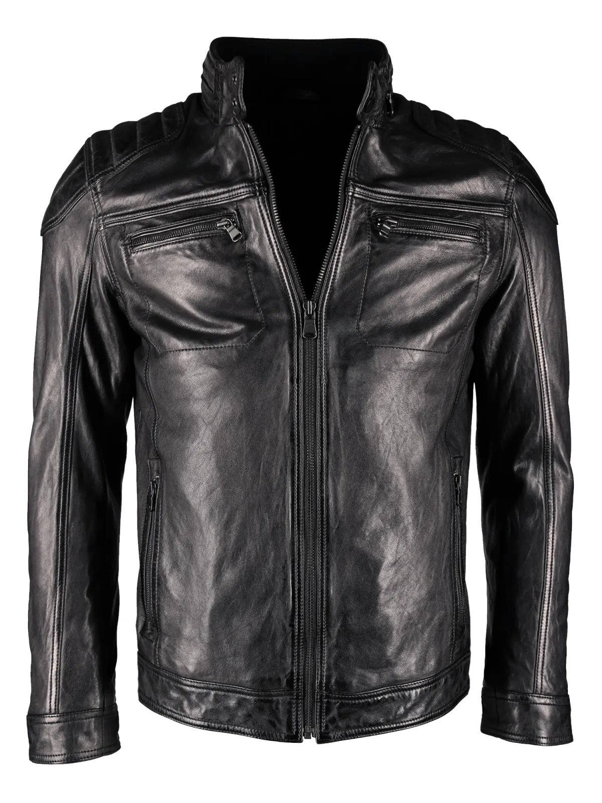Design: Staande kraag, Borstzak, Ritszakken aan de zijkant; Type sluiting: Ritssluiting; Type jas: Bikerjack; Voering: Licht gevoerd; Materiaal: Leer; Motief: Effen; Extra's: Op staal naden, Nappaleer; Pasvorm: Normale pasvorm