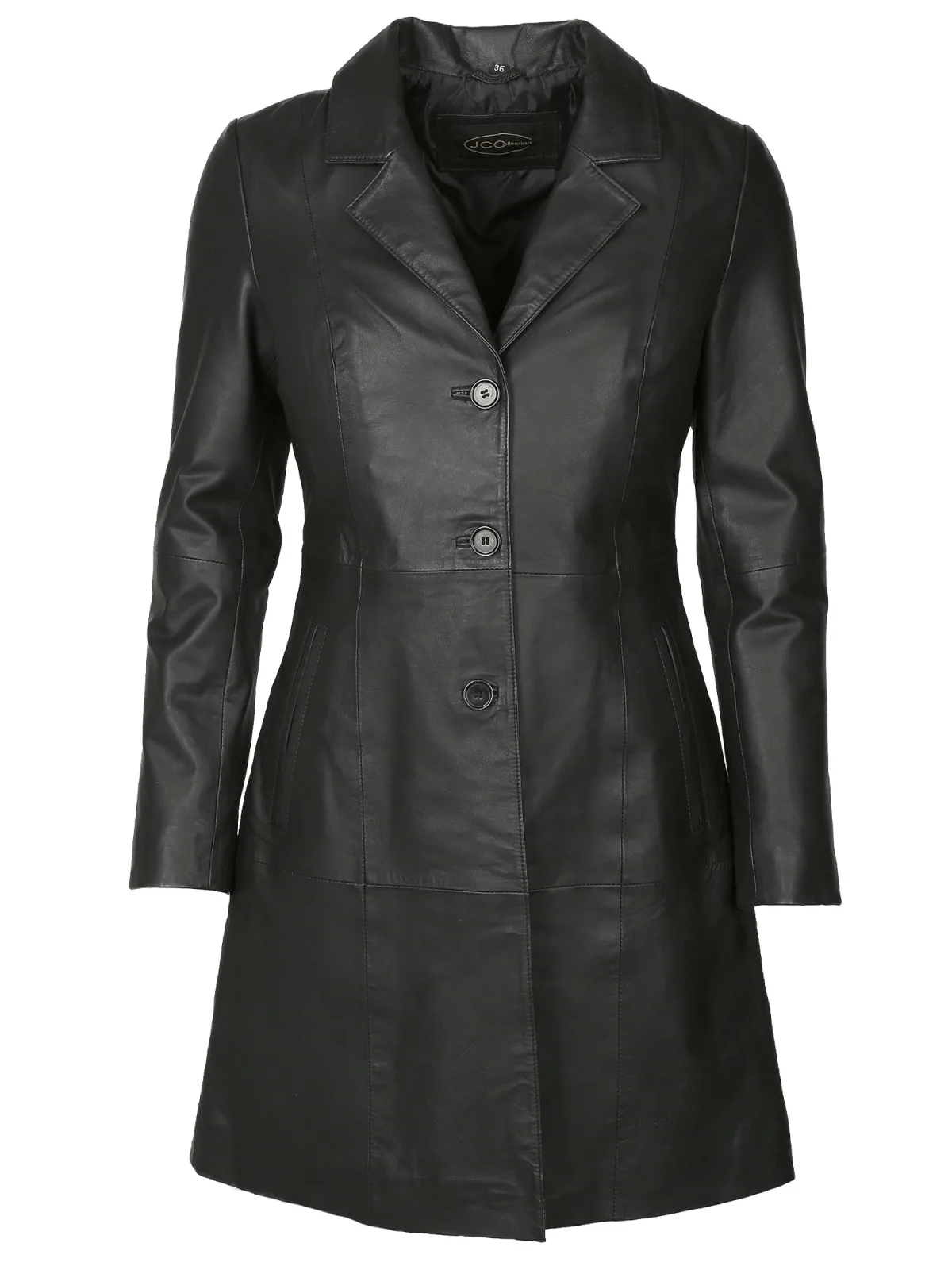 Type mantel: Klassieke mantel; Design: Knop placket, Revers kraag; Type sluiting: Knoopsluiting; Voering: Licht gevoerd; Materiaal: Leer; Motief: Effen; Extra's: Op staal naden; Pasvorm: Slanke pasvorm; Lengte: Normale lengte