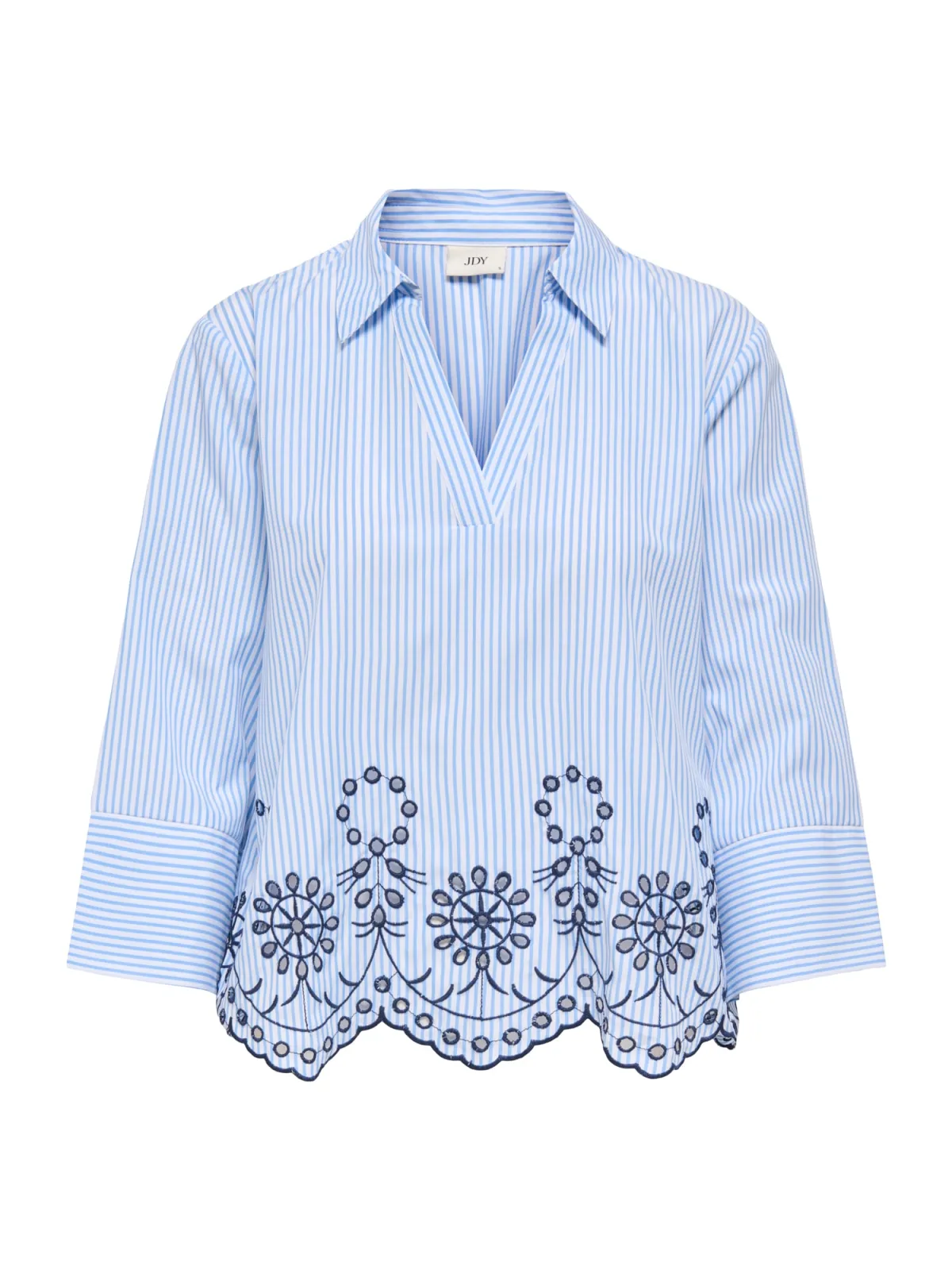 Blouse type: Wijde blouse; Design: Turn-down kraag, Geschulpte zoom; Motief: Gestreept; Details: Borduursels, Mesh; Extra’s: Lichte stof, Voelt zacht aan; Pasvorm: Losse pasvorm; Armlengte: Driekwart mouw; Lengte: Korte pasvorm