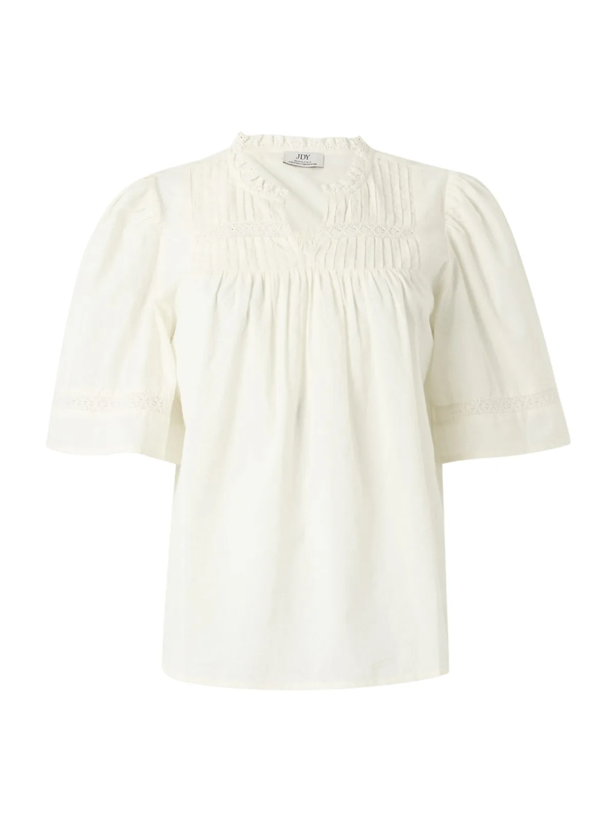 Blouse type: Blouseshirt; Design: Pofmouwen, Nektape; Materiaal: Katoen; Motief: Effen; Kraag: Tuniek kraag; Details: Ruches, Kant, Gedrapeerd, Plissé; Extra's: Biezen, Op staal naden, Lichte stof; Pasvorm: Normale pasvorm; Armlengte: Halve mouw; Lengte: Normale lengte