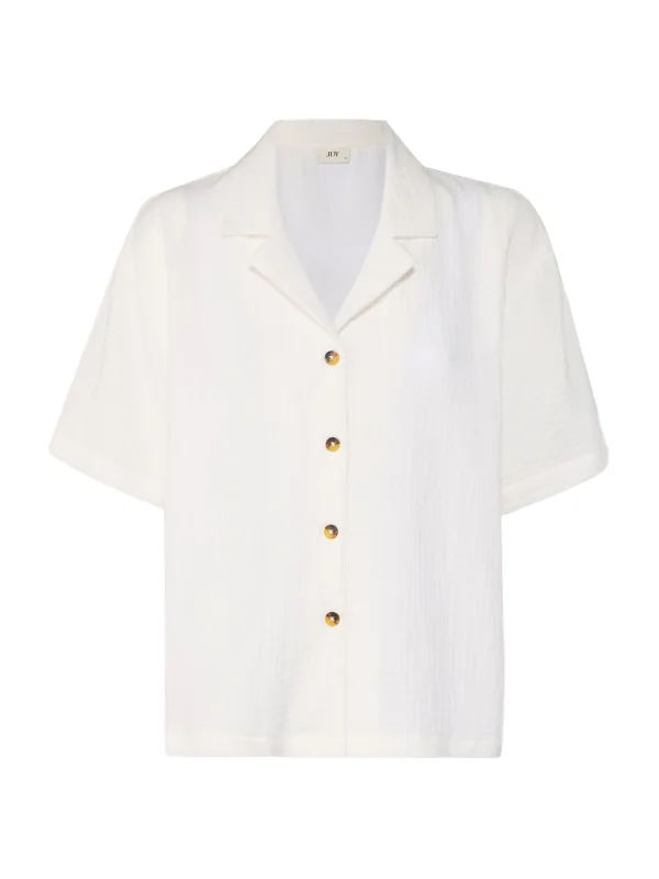 Blouse type: Klassieke blouse; Design: Gevoerde zoom/rand, Knop placket, Revers kraag; Type sluiting: Knoopsluiting; Materiaal: Mousseline; Motief: Effen; Extra's: Op staal naden, Voelt zacht aan; Pasvorm: Losse pasvorm; Armlengte: Halve mouw; Lengte: Normale lengte