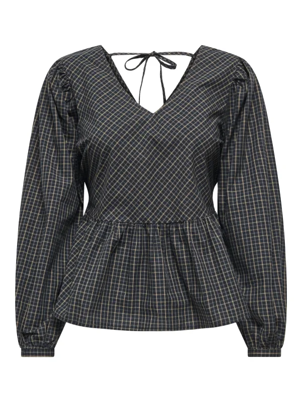 Blouse type: Blouseshirt; Design: Om te knopen/binden; Materiaal: Katoen; Motief: Geruit; Kraag: Zonder kraag; Details: Gedrapeerd; Extra's: All-over patroon; Pasvorm: Normale pasvorm; Armlengte: Lange mouw; Lengte: Normale lengte