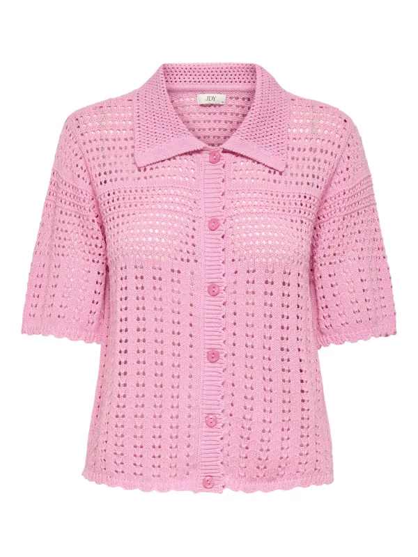 Design: Geschulpte zoom; Type sluiting: Knoopsluiting; Materiaal: Knitwear; Halstype: Polokraag; Motief: Effen; Details: Mesh; Extra's: Licht transparant; Pasvorm: Normale pasvorm; Armlengte: Halve mouw; Lengte: Normale lengte