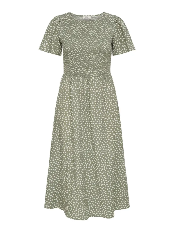 Design: Rechte zoom; Materiaal: Katoen; Halstype: Ronde hals; Motief: Gestippeld; Extra’s: All-over patroon, Voelt zacht aan; Lengte: 3/4 lengte; Snit: Getailleerd; Pasvorm: Normale pasvorm; Armlengte: Kwartmouw