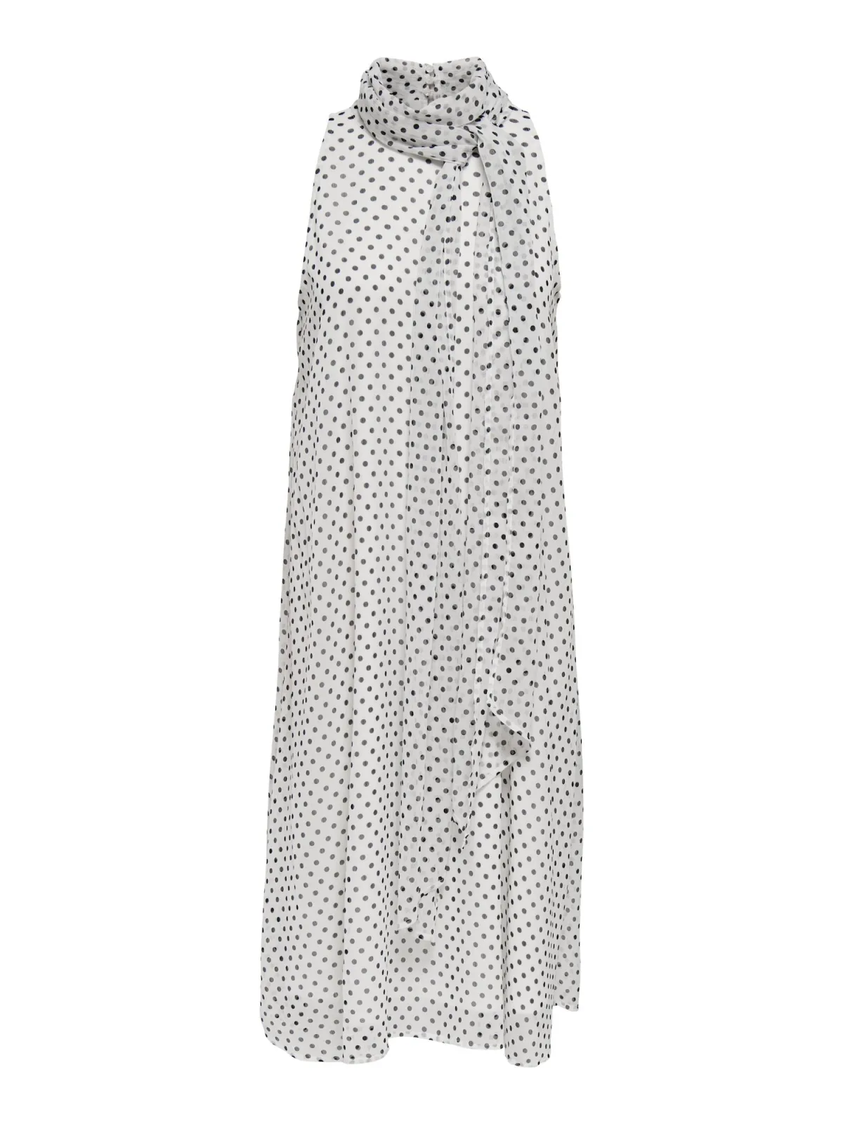 Design: Keyholesluiting; Type sluiting: Knoopsluiting; Halstype: Sjaalkraag; Motief: Gestippeld; Details: Cut-outs, Gedrapeerd; Extra's: All-over patroon; Lengte: 3/4 lengte; Snit: Recht; Pasvorm: Losse pasvorm; Armlengte: Mouwloos
