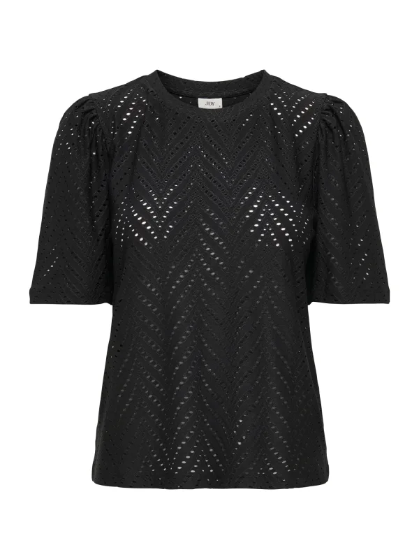 Voor elke dag waarop je net iets meer aangekleed voor de deur wilt staan, is deze JDY dames top Jdycarla een fijne basis. De zwarte top heeft een gesloten ronde hals en korte rechte mouwen, waardoor hij rustig oogt, terwijl de kanten details en het subtiele open detail zorgen voor een vrouwelijke touch. De stof voelt zacht en soepel aan en volgt je bewegingen zonder te knellen.Details die je elke dag draagt Zwarte effen top, makkelijk te combineren met je bestaande garderobe Gesloten ronde hals voor een verzorgde, nette uitstraling Kanten afwerking en open detail voor een verfijnd accent Korte rechte mouwen, ideaal voor het voorjaar en milde dagen Rechtvallende pasvorm, valt losjes langs het lichaam Zachte, soepele stof met lichte stretch voor extra bewegingsvrijheid Geen sluiting, je trekt de top eenvoudig over je hoofd aan Maatadvies: dit model valt normaal Onderhoud: wasbaar op 30 graden, warm strijkbaar, niet in de drogerVan kantoor tot casualDeze zwarte top past net zo goed op een nette broek als op je favoriete jeans. Onder een blazer voor een werkdag of met een rok voor een etentje, de kantdetails geven elke combinatie direct een verzorgde uitstraling.JDY: stijlvol in je dagelijkse levenJDY ontwerpt modieuze items die gemakkelijk in je dagelijkse leven passen. Toegankelijke styles, actuele details en prettige materialen vormen de basis van de collectie. Met deze top voeg je een veelzijdig kledingstuk toe waar je het hele seizoen plezier van hebt.Een fijne keuze als je zoekt naar een zwarte top met net dat beetje extra detail.