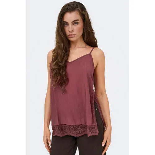 Voor een zachte, vrouwelijke look waar je elke dag zo in stapt, is deze donkerrode dames top met spaghettibandjes een veelzijdige basis in je garderobe. De diepe kleur valt direct op, terwijl de V-hals en het fijne kant langs de randen zorgen voor een verzorgde afwerking. De geweven stof voelt licht en soepel aan op de huid, ideaal voor het voorjaar en de warmere dagen.Details die het verschil maken Donkerrode effen top, makkelijk te combineren met jeans, rok of pantalon Spaghettibandjes en V-hals voor een vrouwelijke, open halslijn Kantdetails langs de hals en zoom voor een subtiel accent Geweven materiaal met 80% viscose dat zacht en soepel aanvoelt Kleine splitjes aan de zijkant voor extra bewegingsvrijheid Onderdeel van de 'Daily' collectie, geschikt voor elke dag Dit artikel valt normaal volgens het maatadvies Onderhoud: wasbaar op 30 graden, lauw strijkbaar en niet in de droogtrommelVeelzijdig in je dagelijkse outfitsDeze JDY top draag je net zo makkelijk naar je werk als in je vrije tijd. Combineer met een blazer voor een nette look of met een luchtig vest voor een relaxte dag. De effen kleur maakt het eenvoudig om te stylen met je favoriete sieraden en tassen.JDY: moderne mode voor elke dagJDY staat bekend om modieuze dameskleding die goed past bij het dagelijks leven. De collecties combineren actuele trends met draagbare basics, zodat je garderobe eenvoudig aan te vullen is met stukken die je vaak pakt. Met deze top kies je voor een item dat licht aanvoelt en eenvoudig te onderhouden is.Een praktische keuze als je een luchtige top zoekt die je het hele seizoen door kunt dragen.