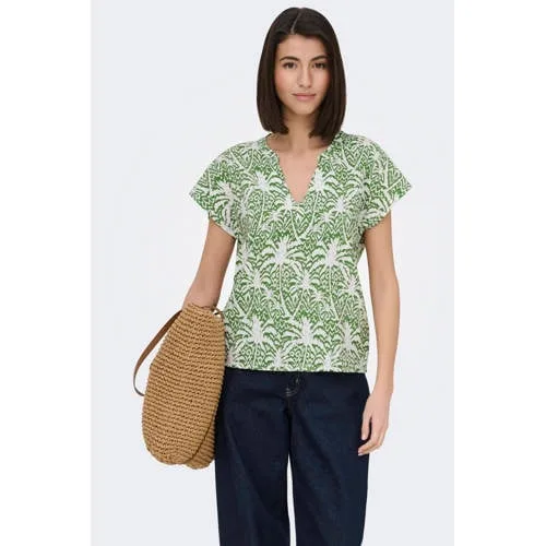 Deze JDY Jdymonia top met bladprint brengt direct een frisse noot in je garderobe. De groen-witte print met bladmotief geeft een rustige, natuurlijke uitstraling, terwijl de rechtvallende pasvorm relaxed oogt en prettig draagt. De geweven stof voelt soepel aan op de huid, ideaal voor lentedagen en milde zomerdagen.Verfijnde details voor elke dag Groen-witte all over bladprint voor een frisse, rustige look Closed neck met subtiele V-hals zorgt voor een vrouwelijk decolleté zonder diep uitgesneden hals Korte, rechte mouwen geven lucht en bewegen makkelijk mee Rechtvallend model dat losjes om het lichaam valt Gemaakt van 83% viscose en 17% nylon, met een soepele, lichte touch Zonder sluiting, je trekt de top eenvoudig over het hoofd aan Maatadvies: valt normaal, kies je gebruikelijke maat Onderhoudsvriendelijk: wasbaar op 30 graden, lauw strijkbaar en niet in de droogtrommelCombineerbaar in jouw dagelijkse looksDeze JDY top past makkelijk in je dagelijkse outfits. Draag de groen-witte print op een lichte jeans of een linnen broek voor een casual look, of combineer met een nette pantalon voor een meer aangeklede uitstraling. De rustige kleuren maken het eenvoudig om te stylen met basic sneakers of sandalen.JDY: eigentijdse stijl voor elke dagJDY ontwerpt mode die goed te combineren is en past bij een actieve, moderne levensstijl. De collecties zijn gebaseerd op actuele trends, met toegankelijke items die je eenvoudig door draagt van werk tot weekend. Zo bouw je zonder moeite een garderobe op waar je elke dag op kunt rekenen.Een lichte, makkelijk te combineren top die moeiteloos meebeweegt met jouw dag.