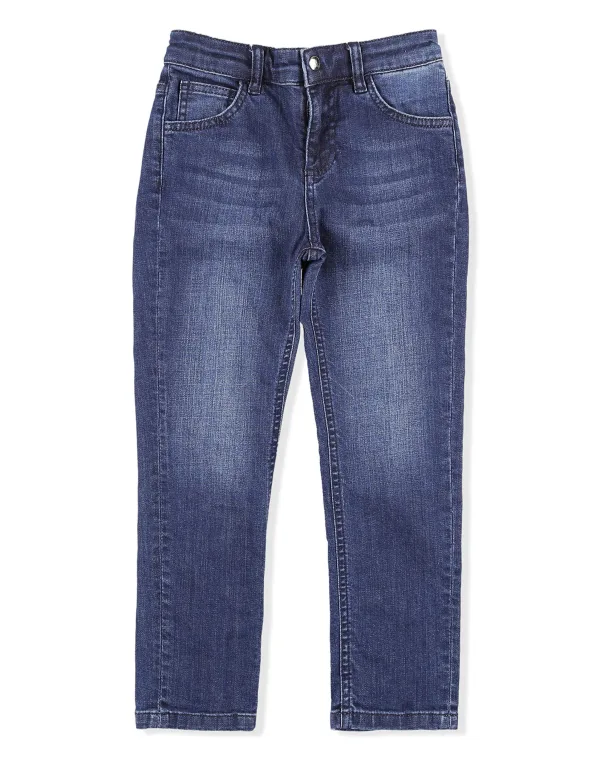 The classic stone washed denim 5 pocket pants cannot miss even in the wardrobe of a kid. This version features one metal button at waist. On the right rear pocket the satin-stitch embroidered lion head. Fit: Regular.
