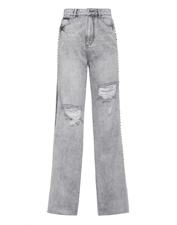 Verfraaid Stone washed denim 5 pocket broek met leren inzetstukken en strass-steentjes. Enkele metalen knoopsluiting. Ruw gesneden onderkant. Pasvorm: Palace.