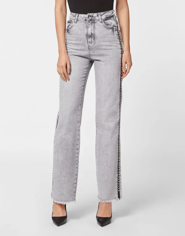 Verfraaid Stone washed denim 5 pocket broek met leren inzetstukken en strass-steentjes. Enkele metalen knoopsluiting. Ruw gesneden onderkant. Pasvorm: Palace.
